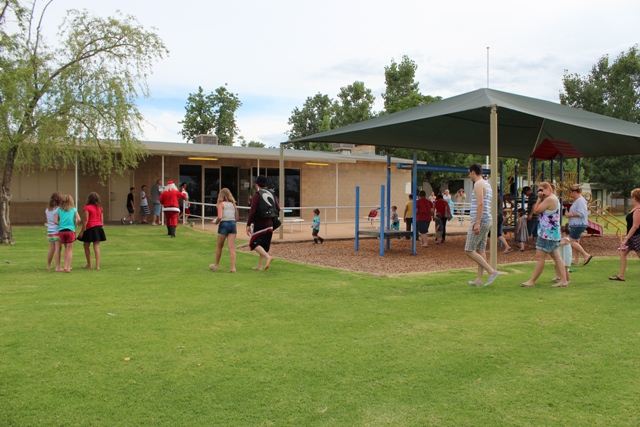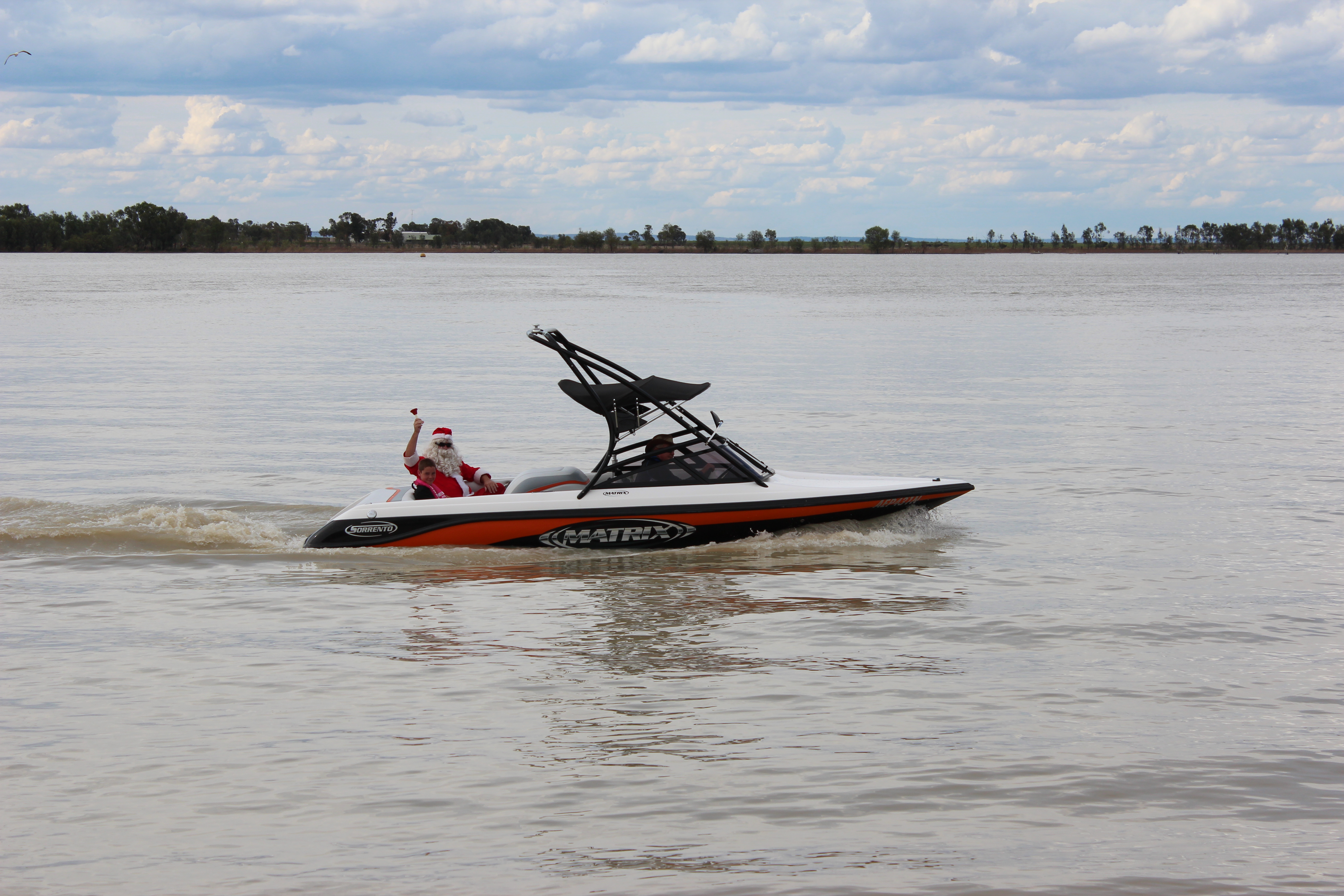 Excited children heard the ringing of Santa’s Bell from the banks and came running towards the shore to get their first glimpse of Santa. Santa came to Copi by boat which is the customary way for the Broken Hill Speedboat Club’s Christmas functions.